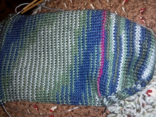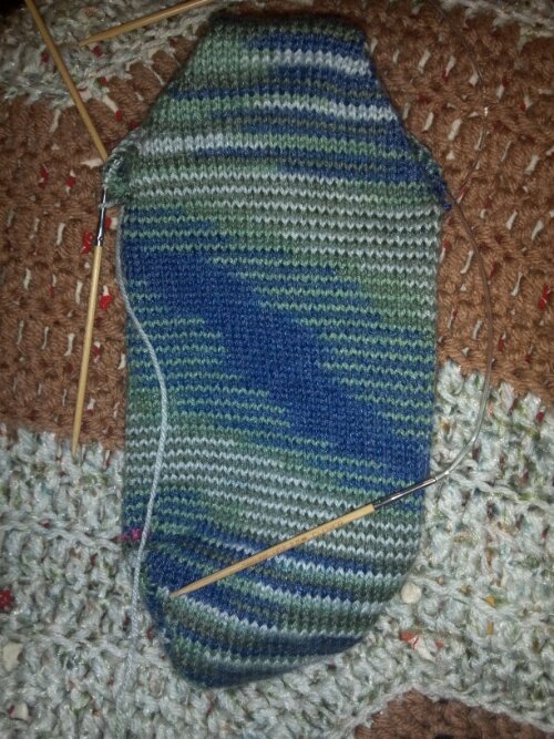 Splotchy socks. First heel turned.